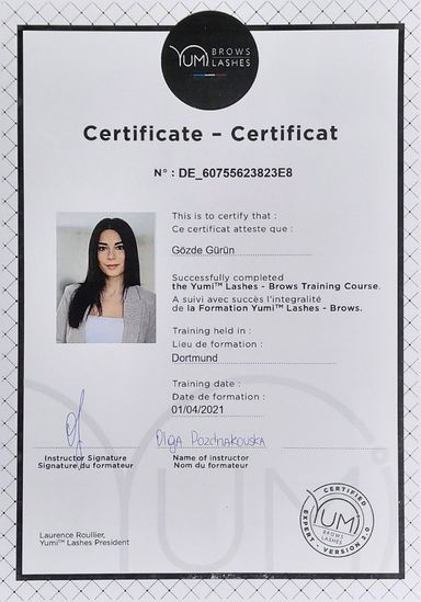 Hierfür wird eine Schulung absolviert und ein Zertifikat vom offiziellen YUMI™ LASHES Distributor ausgestellt.